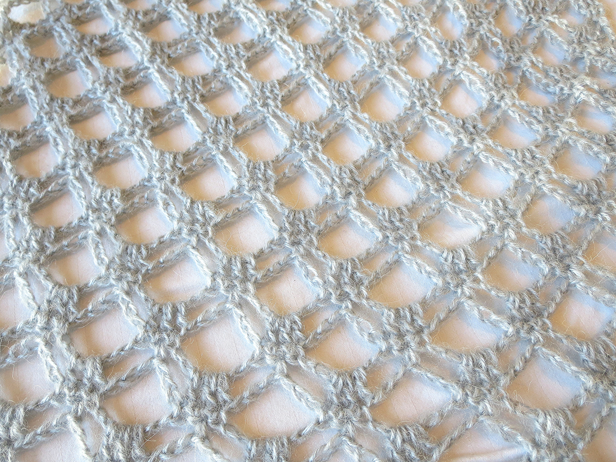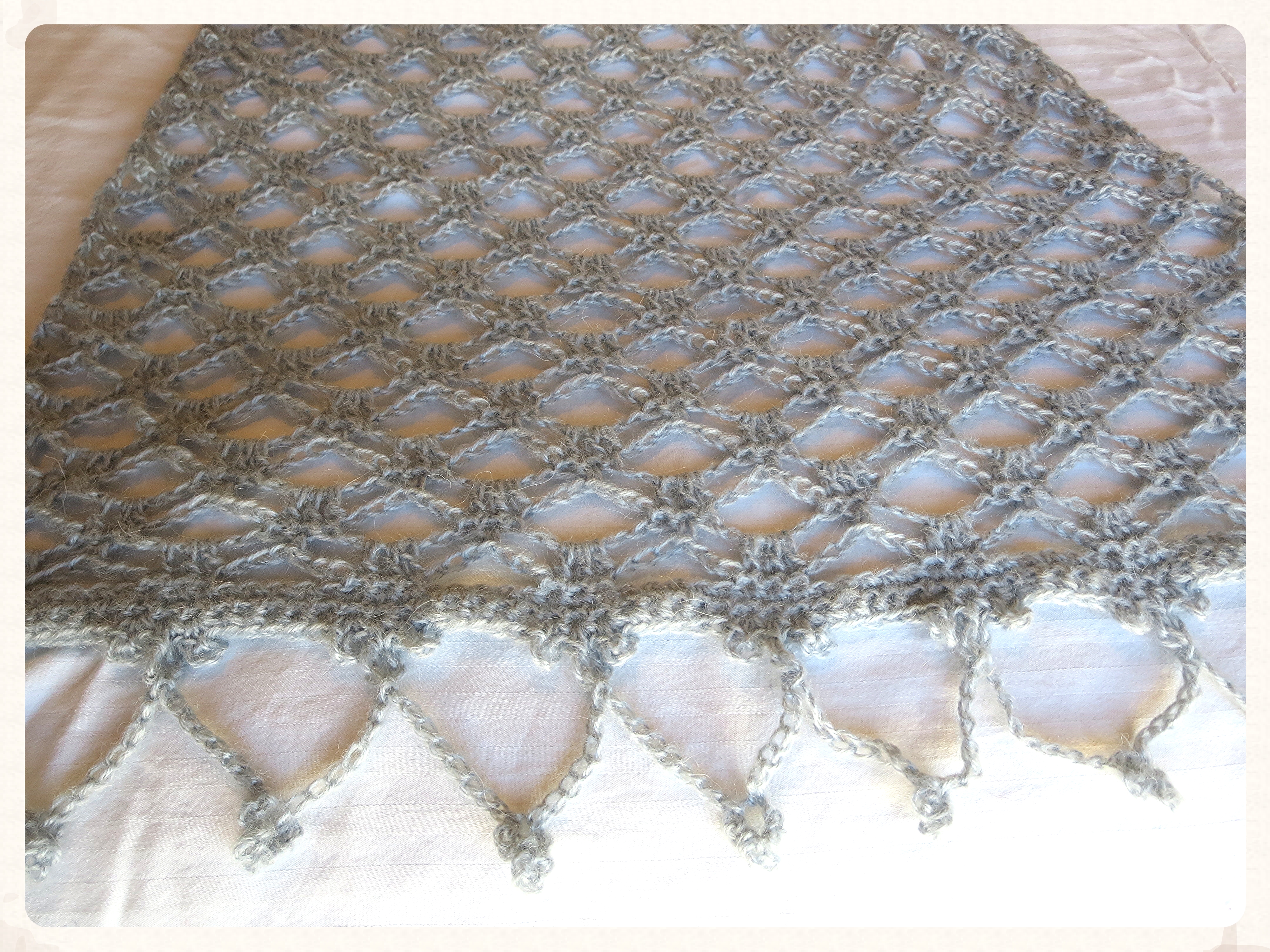 This shawl was made with Deborah Norville Alpaca Dance yarn in the color Silver Fog.