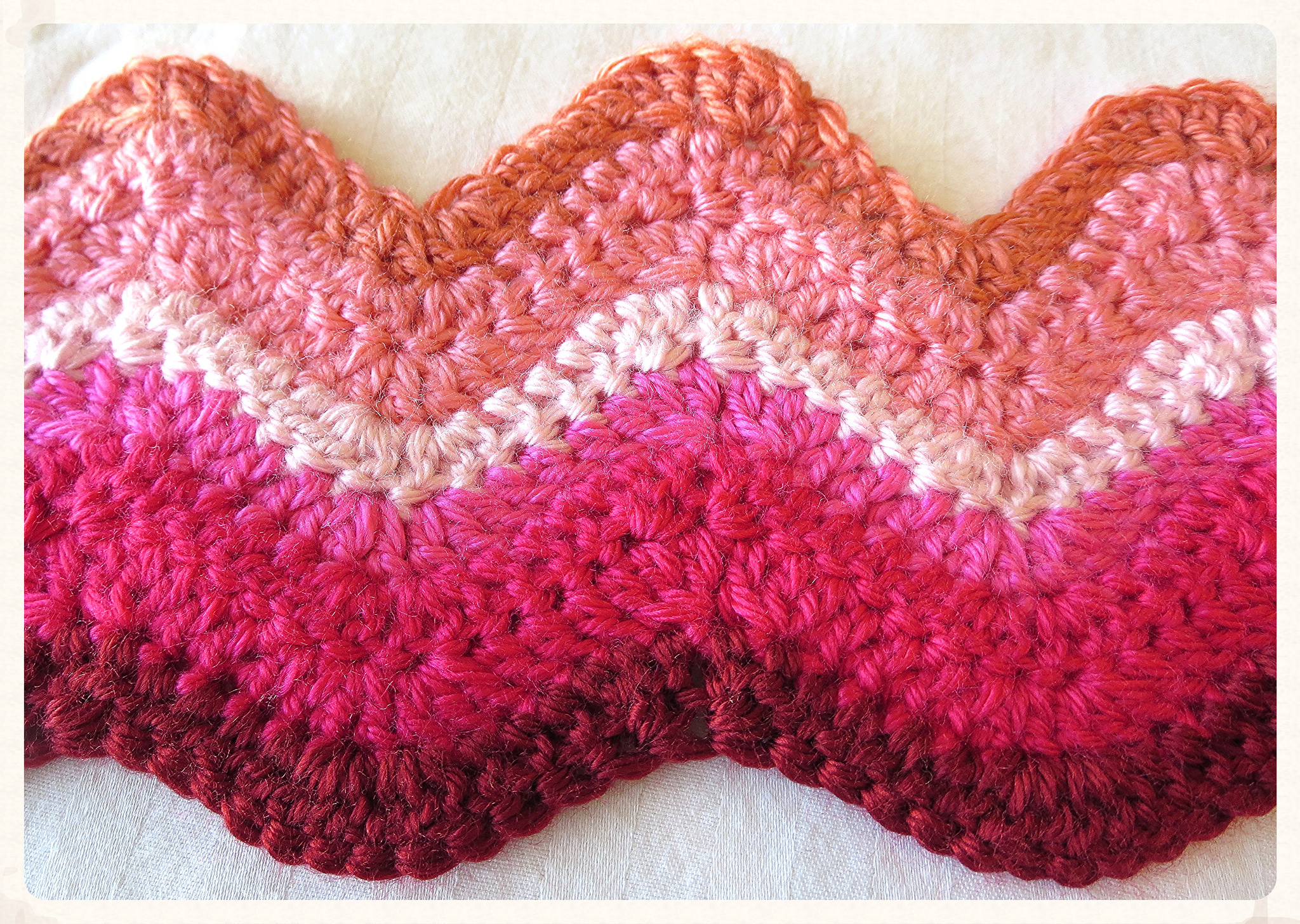 This scarf was made using Caron Simply Soft yarn in the colors: Persimmon, Strawberry, Soft Pink, Watermelon, Neon Pink, and Burgundy.
